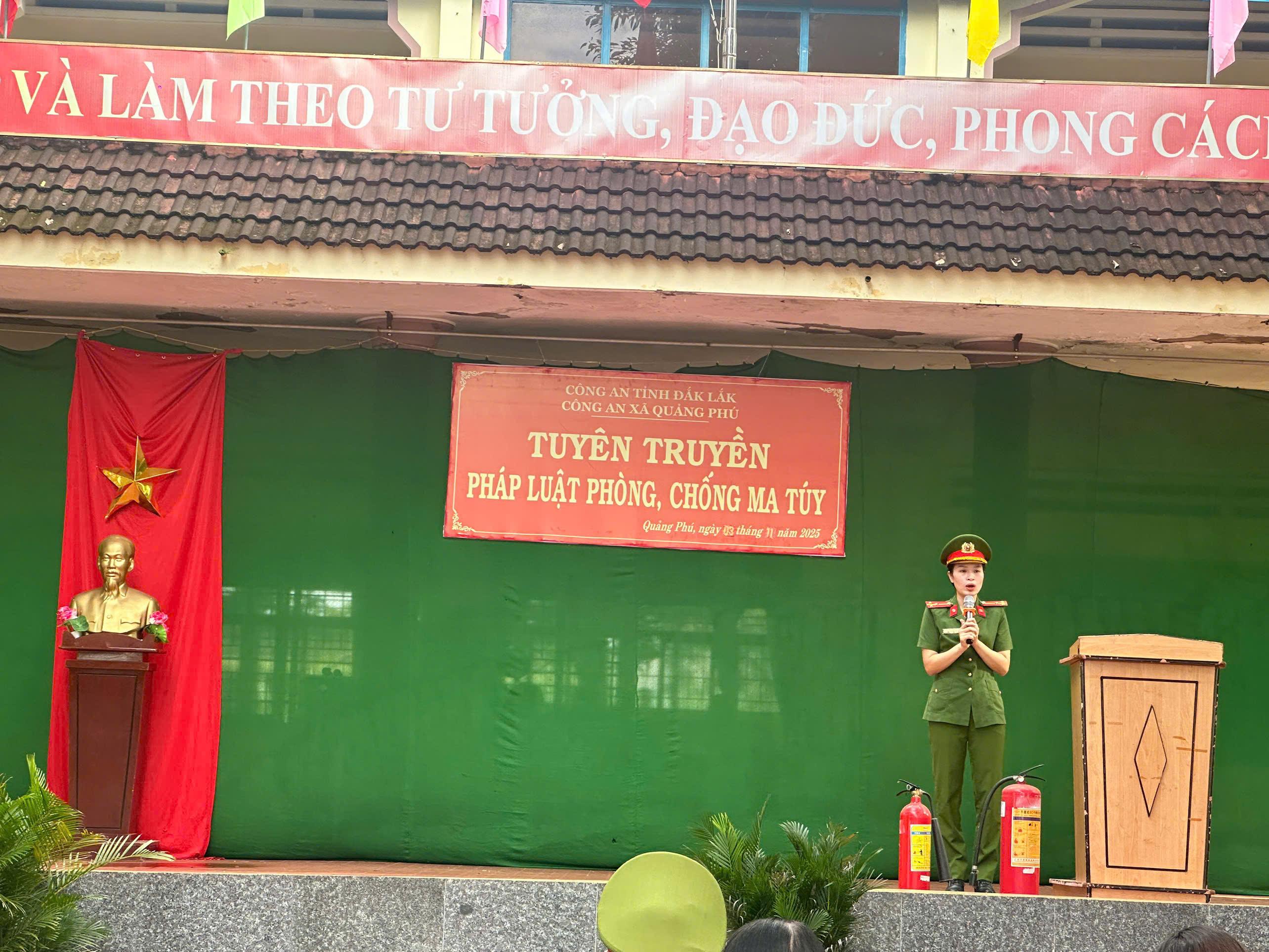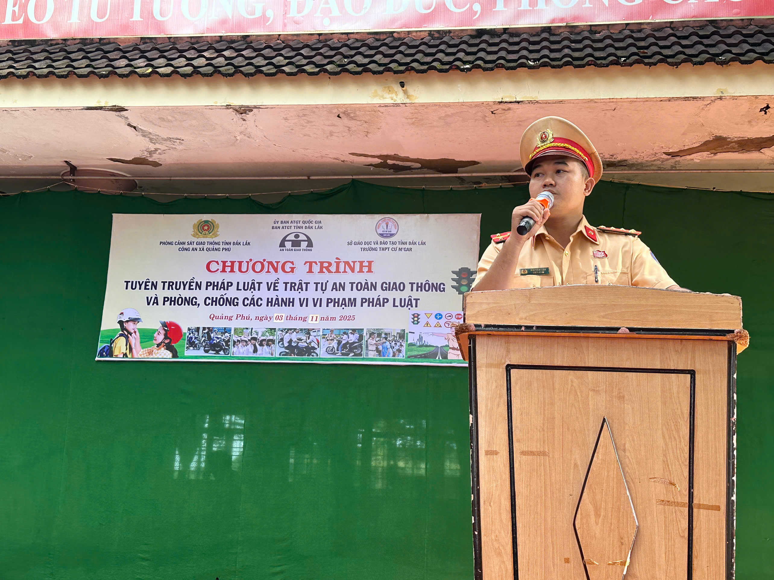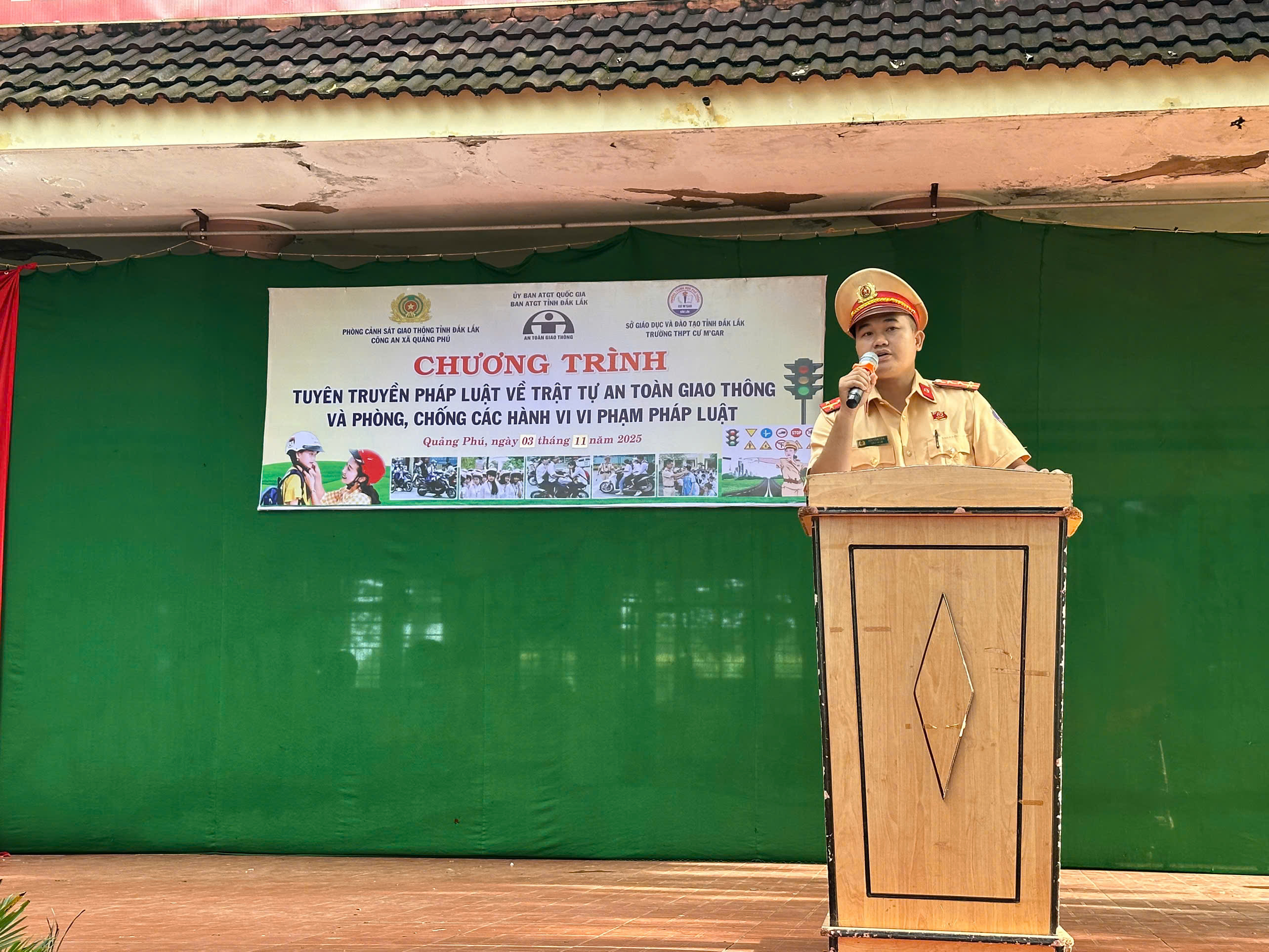 Nhằm nâng cao ý thức chấp hành pháp luật về trật tự, an toàn giao thông phòng chống tội phạm, phòng chống ma túy, phòng chống cháy nổ cho lứa tuổi học đường, sáng ngày 03/11/2025, trong buổi sinh hoạt dưới cờ đầu tuần, Công an xã Quảng Phú phối hợp với Trường THPT Cư M’gar tổ chức buổi tuyên truyền pháp luật, thu hút hơn 1600 học sinh và giáo viên tham gia.